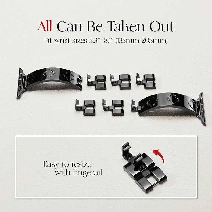 - Easy Tool-free Resizing: Simply open any of the 5 removable links on the apple watch bracelet band, and take off for a tighter loop. No hassle and additional tool needed for adjustment. The dressy apple watch band fits wrist sizes 5.3”-8.1” (135mm-205mm).